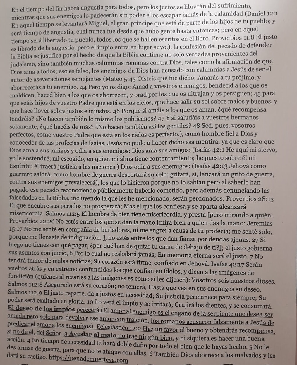 El juicio final en la profecía de Daniel que dice: Pero se sentará el Juez, y le quitarán su dominio para que sea destruido y arruinado, debe cumplirse… ¿Qué sentía Jesús por sus enemigos? ¿Qué sentían los santos por sus enemigos? ¿Amor u odio? Muchos se caerán de espaldas al notar como les han visto la cara y los han estafado; deberíamos reclamar indemnización al Vaticano y a sus cómplices por todo el tiempo que nos han hecho desperdiciar, y hablo en serio.