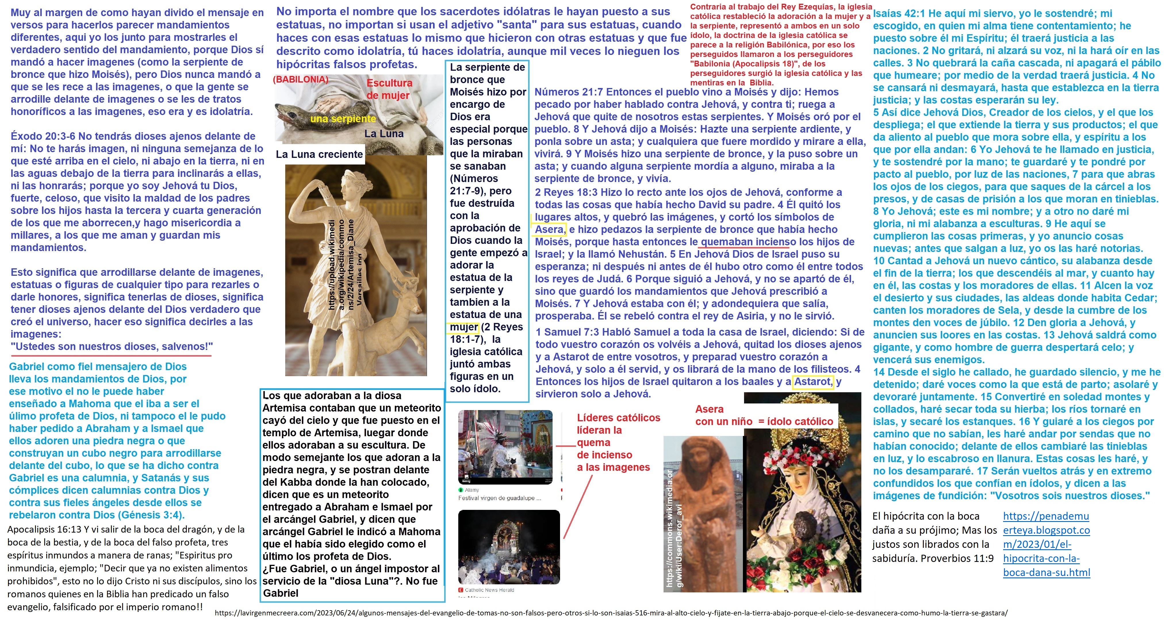 «Soy el héroe de la princesa y eso le jode al villano de escamas al cual le digo: «Aleja tus estatuas de ella, infeliz idólatra rebelde!, la ley de mi Dios dice: Éxodo 20:5 No te inclinarás a las imágenes, ni las honrarás; porque yo soy Jehová tu Dios celoso. Y como no has respetado este mandamiento, has falsificado el evangelio, por eso la Biblia tiene mentiras de Roma, con las cuales a ella no la engañarás, serpiente antigua!!, la virgen justa creerá en mi testimonio y no en tus calumnias» https://eltestimoniodegabriel.link (https://gabriels.work) https://lavirgenmecreera.com (https://ellameencontrara.com). Muchas son las formas de los ídolos, muchos son los falsos profetas que te dicen: «Inclínate delante de ellos y dale tu honra rezando con la cabeza agachada delante de ellos», pero con cinismo te llaman idólatra si haces lo mismo con una estatua no aprobada por ellos, te llaman idólatra si haces lo mismo con una imagen no «bendecida» por ellos. No te dejes engañar por ellos, por frases de ellos tales como: «Pero esta no es la imagen de un demonio sino de la virgen», «Nosotros no adoramos imágenes, las veneramos», los nombres que les pongan a las imágenes no cambia los hechos condenados por Dios: Idolatría. El verbo que usen no cambia lo que hacen: Isaías 2:8 Además su tierra está llena de ídolos, y se han arrodillado ante la obra de sus manos y ante lo que fabricaron sus dedos. 9 Y se ha inclinado el hombre, y el varón se ha humillado; por tanto, no los perdones. 10 Métete en la peña, escóndete en el polvo, de la presencia temible de Jehová, y del resplandor de su majestad. 11 La altivez de los ojos del hombre será abatida, y la soberbia de los hombres será humillada; y Jehová solo será exaltado en aquel día. El imperio romano no ha respetado el mandamiento más importante de Dios, por eso tampoco ha respetado el evangelio y por eso la Biblia tiene mentiras, y esas mentiras no provienen de Dios, esas mentiras provienen de los romanos perseguidores. ELLAMEENCONTRARA.COM Apocalipsis 19:8 Y a ella se le ha concedido que se vista de lino fino, limpio y resplandeciente; porque el lino fino es las acciones justas de los santos. A ella se le concede aceptar que la Biblia contiene algunas falsedades de la serpiente!. LAVIRGENMECREERA.COM Levítico 21:13 El tomará por esposa a una mujer virgen. 14 No tomará viuda, ni repudiada, ni infame, ni ramera, sino tomará de su pueblo una virgen por mujer. Porque ella creerá en mi testimonio porque ella es de mi pueblo: ELTESTIMONIODEGABRIEL.LINK