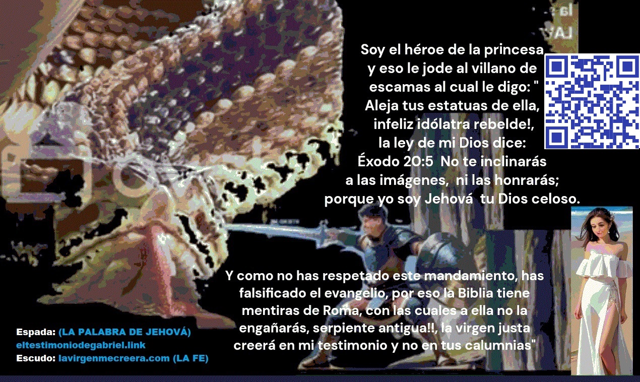 «Soy el héroe de la princesa y eso le jode al villano de escamas al cual le digo: «Aleja tus estatuas de ella, infeliz idólatra rebelde!, la ley de mi Dios dice: Éxodo 20:5 No te inclinarás a las imágenes, ni las honrarás; porque yo soy Jehová tu Dios celoso. Y como no has respetado este mandamiento, has falsificado el evangelio, por eso la Biblia tiene mentiras de Roma, con las cuales a ella no la engañarás, serpiente antigua!!, la virgen justa creerá en mi testimonio y no en tus calumnias» https://eltestimoniodegabriel.link (https://gabriels.work) https://lavirgenmecreera.com (https://ellameencontrara.com)