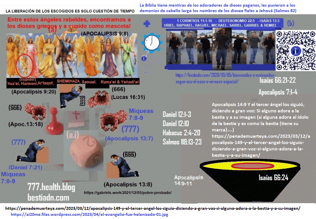 Libro de Enoc 90:10 «Os digo y os anuncio que quien os ha creado os derrocará y sobre vuestra ruina no habrá misericordia pues vuestro Creador se alegrará de vuestra destrucción. 11 «Y vosotros justos en esos días seréis un reproche el resto. https://eltiempoesmiamigo.blogspot.com/2023/01/libro-de-enoc-9010-os-digo-y-os-anuncio.html |
