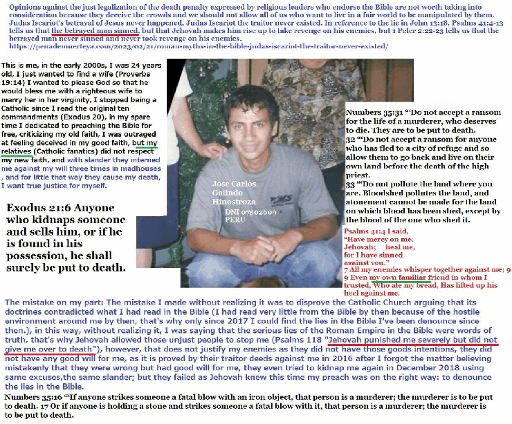 Psalm 69:21 says: “They gave me gall for food, and for my thirst they gave me vinegar to drink.” This is cited as a fulfilled prophecy in John 19:29-30 when Jesus drank vinegar on the cross. But if one reads the full context of Psalm 69, the tone is not one of forgiveness or love for the enemy. What immediately follows is judgment: “Let their table become a trap” (v. 22), and it continues with curses and condemnations. There is no “Father, forgive them” as in Luke 23:34. The Gospels say that Jesus fulfills this prophecy, but they ignore the sequence of judgments that accompanies it. Thus, they present a partial and manipulated reading to sustain an image that does not correspond to the original text. Because of this truth ignored by the falsifiers of the gospel, I defend the death penalty and not the love of the enemy, but of the friend.