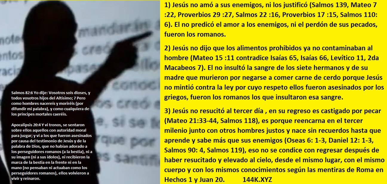 1) Jesús no amó a sus enemigos, ni los justificó (Salmos 139, Mateo 7:22, Proverbios 29:27, Salmos 22:16, Proverbios 17:15, Salmos 110:6). El no predicó el amor a los enemigos, ni el perdón de sus pecados, fueron los romanos.