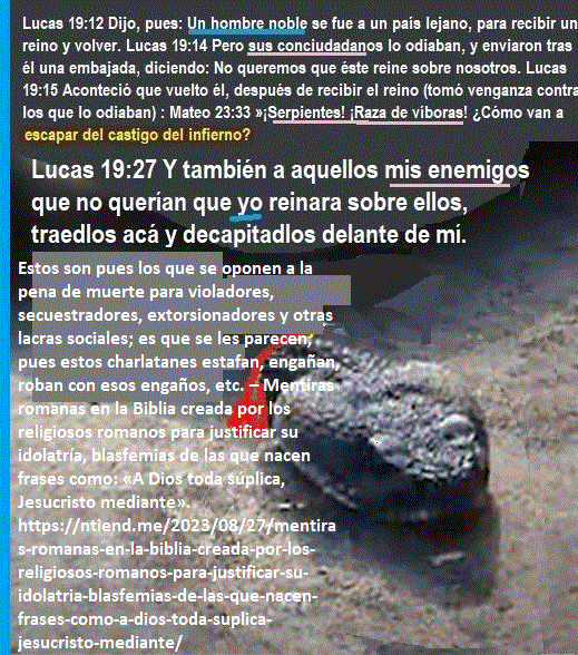 Existe gente que ama al Diablo porque les crea derechos inmerecidos a los hijos del Diablo, los hijos del Diablo son asesinos, extorsionadores y calumniadores, al igual que el Diablo, los romanos actuaron como el Diablo al asesinar a Cristo y a los cristianos de verdad; Después de eso los usurparon, pero no sin antes falsificar sus mensajes con doctrinas diabólicas como por ejemplo: «Amar a los hijos del Diablo (Mateo 5:38-44 versus Mateo 13:38-43)», bajo la excusa de obedecer esta falsa doctrina, los adoradores de Lucifer se oponen a la justa pena de muerte. En mi página web ntiend.me lucho contra los intereses de los adoradores de Lucifer, pero lucho a favor de los intereses de la justicia que Dios defiende, por eso Dios me defiende y protege. Los defensores de estas bestias (asesinos, extorsionadores y calumniadores) están en guerra contra nosotros quienes somos la gente de bien, nuestros enemigos han falsificado el mensaje de justicia con la doctrina del «amor a la bestia» (el amor al enemigo), algo inútil porque la bestia es reincidente (Daniel 12:10). Apocalipsis 19:19 Y vi a la bestia, a los reyes de la tierra y a sus ejércitos, reunidos para guerrear contra el que montaba el caballo, y contra su ejército. Apocalipsis 12:9-12 El gran engaño del perseguidor romano en la Biblia es destruido.