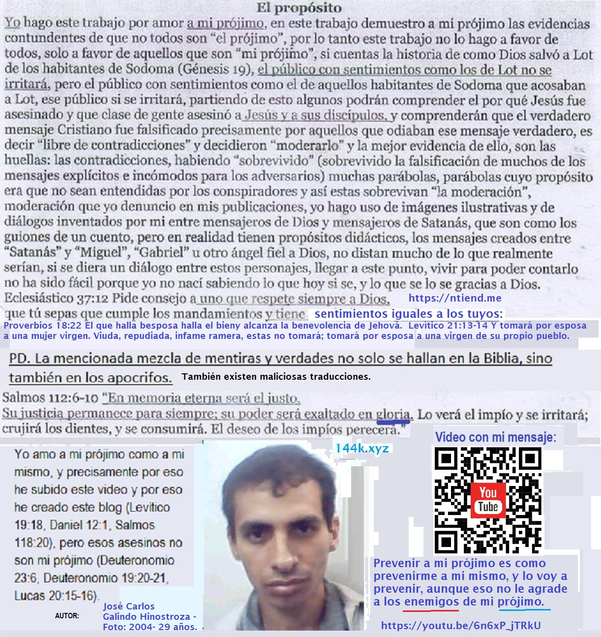 https://itwillbedotme.wordpress.com/wp-content/uploads/2025/03/idi01-ella-me-encontrara-la-mujer-virgen-me-creera-.docx Ella me encontrará, la mujer virgen me creerá. ( https://ellameencontrara.com – https://lavirgenmecreera.com – https://shewillfind.me ) Este es el trigo en la Biblia que destruye la cizaña romana en la Biblia: Apocalipsis 19:11 Entonces vi el cielo abierto, y había un caballo blanco; y el que lo montaba se llamaba Fiel y Verdadero, y con justicia juzga y hace la guerra. Apocalipsis 19:19 Y vi a la bestia, y a los reyes de la tierra, y a sus ejércitos reunidos para hacer guerra contra el que estaba sentado en el caballo y contra su ejército. Salmos 2:2-4 «»Los reyes de la tierra se levantan, y los gobernantes consultan unidos contra el Señor y contra su ungido, diciendo: ‘Rompamos sus ataduras y echemos de nosotros sus cuerdas.’ El que mora en los cielos se reirá; el Señor se burlará de ellos.»» Ahora, un poco de lógica básica: si el jinete lucha por la justicia, pero la bestia y los reyes de la tierra luchan contra este jinete, entonces la bestia y los reyes de la tierra están en contra de la justicia. Por lo tanto, representan el engaño de las falsas religiones que gobiernan con ellos. La gran ramera de Babilonia, que es la iglesia falsa creada por Roma, se ha considerado a sí misma «»la esposa del ungido del Señor»», pero los falsos profetas de esta organización que vende ídolos y palabras aduladoras no comparten los objetivos personales del ungido del Señor y de los verdaderos santos, porque los líderes impíos han elegido para sí mismos el camino de la idolatría, el celibato o la sacramentalización de matrimonios impíos a cambio de dinero. Sus sedes religiosas están llenas de ídolos, incluyendo falsos libros sagrados, ante los cuales se inclinan: Isaías 2:8-11 8 Su tierra está llena de ídolos; se postran ante la obra de sus manos, ante lo que hicieron sus dedos. 9 El hombre se ha inclinado, y el hombre se ha humillado; por tanto, no los perdones. 10 Métete en la peña, escóndete en el polvo, ante la temible presencia del SEÑOR y la gloria de su majestad. 11 La altivez de los ojos del hombre será abatida, y la soberbia de los hombres será humillada; solo el SEÑOR será exaltado en aquel día. Proverbios 19:14 Casa y riquezas son herencia de los padres, pero la mujer prudente es del SEÑOR. Levítico 21:14 El sacerdote del SEÑOR no tomará por esposa a una viuda, ni a una divorciada, ni a una mujer impura, ni a una ramera; tomará por esposa a una virgen de su propio pueblo. Apocalipsis 1:6 Y nos hizo reyes y sacerdotes para su Dios y Padre; a él sea la gloria y el dominio por los siglos de los siglos. 1 Corintios 11:7 La mujer es la gloria del hombre. ¿Qué significa en Apocalipsis que la bestia y los reyes de la tierra hacen la guerra al jinete del caballo blanco y su ejército? El significado es claro, los líderes mundiales están mano a mano con los falsos profetas que son diseminadores de las religiones falsas que dominan entre los reinos de la tierra, por razones obvias, eso incluye el cristianismo, el Islam, etc. Estos gobernantes están en contra de la justicia. y la verdad, cuáles son los valores que defiende el jinete del caballo blanco y su ejército leal a Dios. Como es evidente, el engaño es parte de los falsos libros sagrados que estos cómplices defienden con la etiqueta “Libros Autorizados de las Religiones Autorizadas”, pero la única religión que defiendo es la justicia, defiendo el derecho de los justos a no ser engañados con engaños religiosos. Apocalipsis 19:19 Entonces vi la bestia y los reyes de la tierra y sus ejércitos reunidos para hacer guerra contra el jinete del caballo y contra su ejército. Apocalipsis 19:11 Entonces vi el cielo abierto, y he aquí un caballo blanco. El que estaba sentado en él se llamaba Fiel y Verdadero, y con justicia juzga y hace la guerra. Ahora una lógica básica, si el jinete defiende la justicia, pero la bestia y los reyes de la tierra luchan contra este jinete, entonces la bestia y los reyes de la tierra están en contra de la justicia, por lo tanto defienden el engaño de las religiones falsas que gobiernan con ellos.Un duro golpe de realidad es a «Babilonia» la «resurrección» de los justos, que es a su vez la reencarnación de Israel en el tercer milenio: La verdad no destruye a todos, la verdad no duele a todos, la verdad no incomoda a todos: Israel, la verdad, nada más que la verdad, la verdad que duele, la verdad que incomoda, verdades que duelen, verdades que atormentan, verdades que destruyen.Esta es mi historia: José, un joven criado en enseñanzas católicas, vivió una serie de acontecimientos marcados por relaciones complejas y manipulaciones. A los 19 años inició una relación con Mónica, una mujer posesiva y celosa. Aunque José sentía que debía terminar la relación, su formación religiosa lo llevó a intentar cambiarla con amor. Sin embargo, los celos de Mónica se intensificaron, especialmente hacia Sandra, una compañera de clase que le hacía insinuaciones a José.