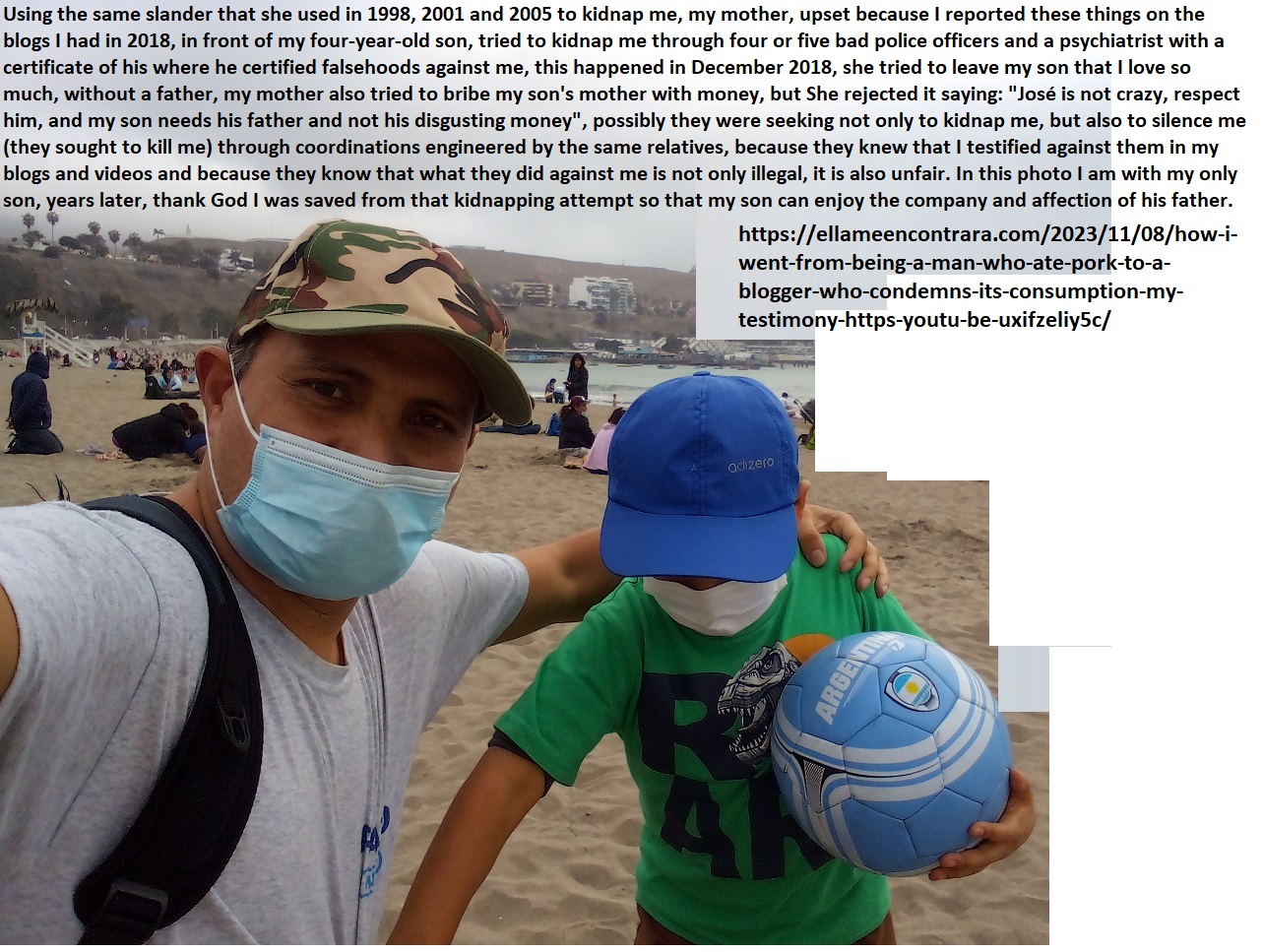 Using the same slander that she used in 1998, 2001 and 2005 to kidnap me, my mother, upset because I reported these things on the blogs I had in 2018, in front of my four-year-old son, tried to kidnap me through four or five bad police officers and a psychiatrist with a certificate of his where he certified falsehoods against me, this happened in December 2018, she tried to leave my son that I love so much, without a father, my mother also tried to bribe my son’s mother with money, but She rejected it saying: «José is not crazy, respect him, and my son needs his father and not his disgusting money», possibly they were seeking not only to kidnap me, but also to silence me (they sought to kill me) through coordinations engineered by the same relatives, because they knew that I testified against them in my blogs and videos and because they know that what they did against me is not only illegal, it is also unfair. In this photo I am with my only son, years later, thank God I was saved from that kidnapping attempt so that my son can enjoy the company and affection of his father.