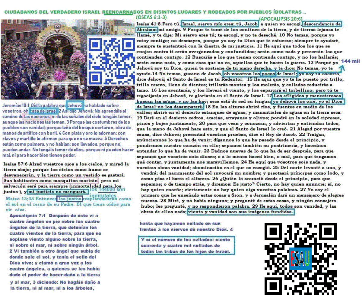 Tengo bastante tiempo ya diciendo esto, los justos son aquel Israel a favor del cual hablan las profecías para el tiempo del fin, ellos son los justos que han reencarnado en diferentes partes del mundo, no estamos hablando aquí de las personas nacidas en un territorio en específico o de un país geográfico en particular. Hablamos de un grupo de personas que tienen como característica común el apego a la justicia.