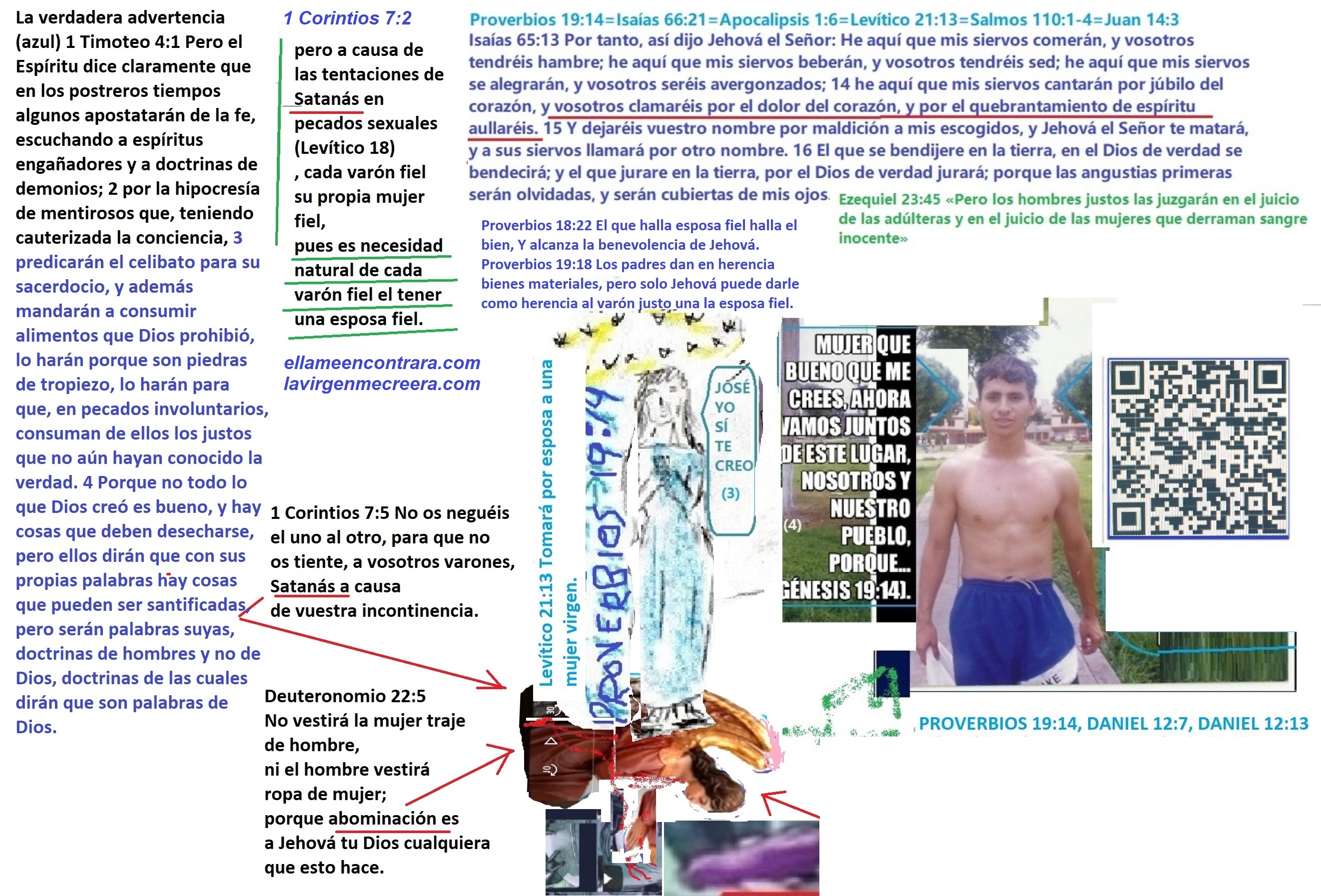 Levítico 21:13-14 El sacerdote de Dios tomará por esposa a una mujer virgen. El no tomará por esposa a viuda, ni mujer repudiada, ni mujer infame, ni mujer prostituta, sino tomará de su pueblo una virgen por mujer. Apocalipsis 1:6 y nos hizo reyes y sacerdotes para Dios, su Padre; a él sea gloria e imperio por los siglos de los siglos. Amén. Proverbios 18:22 El que halla esposa virtuosa halla el bien, Y alcanza la benevolencia de Jehová. Isaías 66:21-24 Y tomaré también de ellos para sacerdotes y levitas, dice Jehová. Porque como los cielos nuevos y la nueva tierra que yo hago permanecerán delante de mí, dice Jehová, así permanecerá vuestra descendencia y vuestro nombre. Y de mes en mes, y de día de reposo en día de reposo, vendrán todos a adorar a Jehová delante de mí, dijo Jehová. Y saldrán, y verán los cadáveres de los hombres que se rebelaron contra mí; porque su gusano nunca morirá, ni su fuego se apagará, y serán abominables a todo hombre.