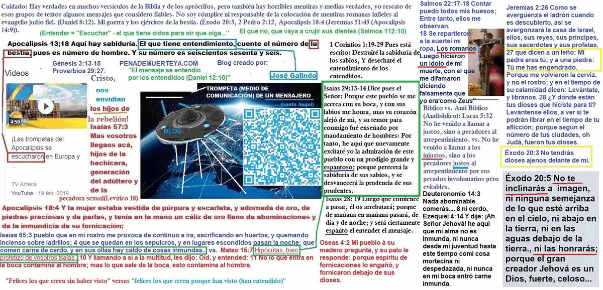 Esas escrituras que dicen que Jesús resucitó de entre los muertos, que Judas Iscariote traicionó a Jesús, que Jesús nació de una virgen, que Saulo se convirtió en Pablo, que no existen más alimentos inmundos y prohibidos, que Jesús negó el ojo por ojo y diente por diente, y predicó el amor a los enemigos, que Jesús dijo que en la vida eterna los hombres justos no tomarán esposa (Mateo 22:30 contradice Isaías 66:21-24, Levítico 21, Apocalipsis 6), etc, etc., son falsedades que fueron creadas por Satanás para confundir a los hijos de Dios porque sabía que estos iban a reencarnar como ignorantes en el tercer milenio (Oseas 6).