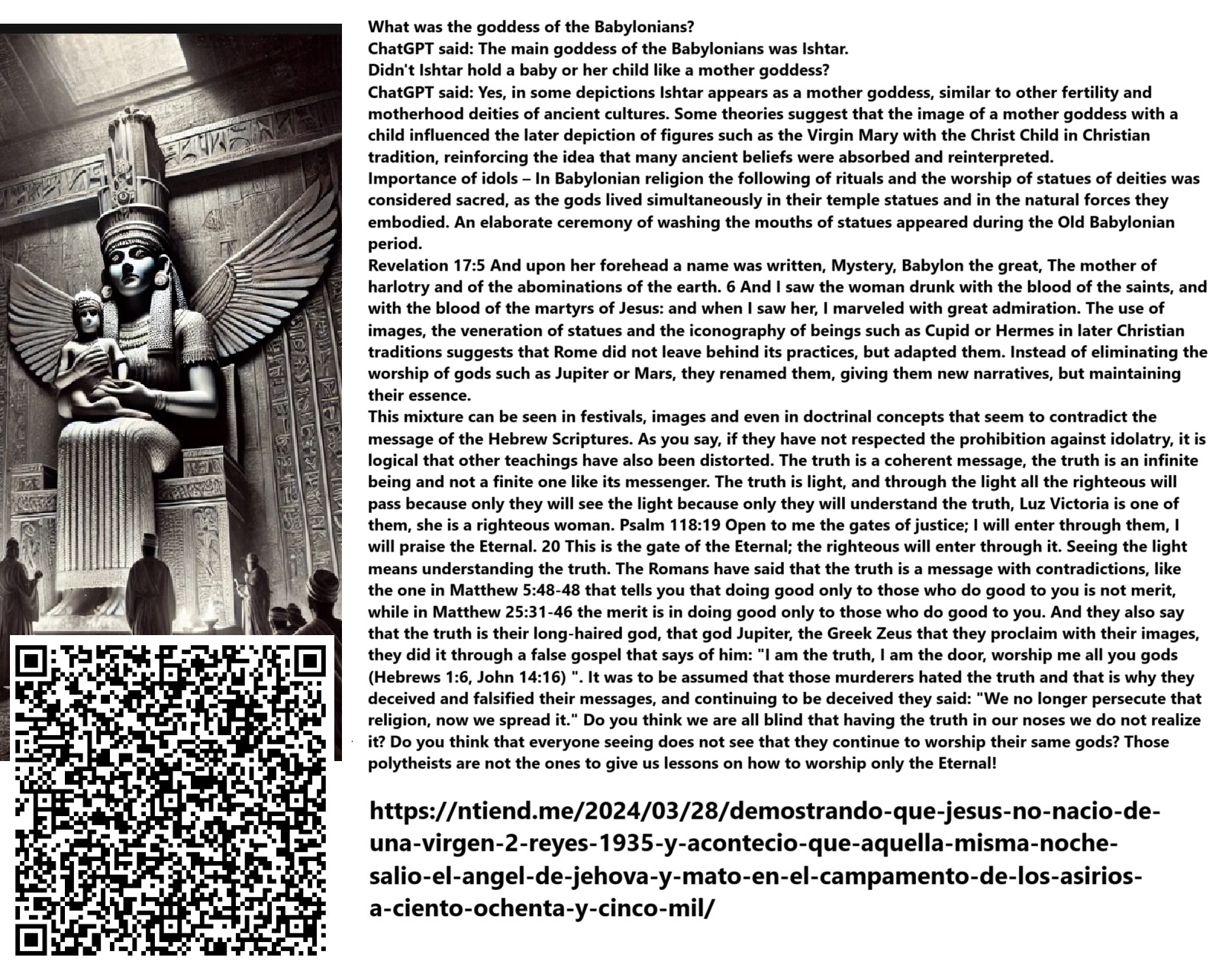 I made the mistake of defending the faith in the Bible, but out of ignorance. However, now I see that it is not the guiding book of the religion that Rome persecuted, but of the one it created to please itself with celibacy. That’s why they preached a Christ who doesn’t marry a woman, but rather His church, and angels who, despite having male names, do not look like men (draw your own conclusions). These figures are akin to the false saints—plaster-statue kissers—and similar to the Greco-Roman gods because, in fact, they are the same pagan gods under different names.