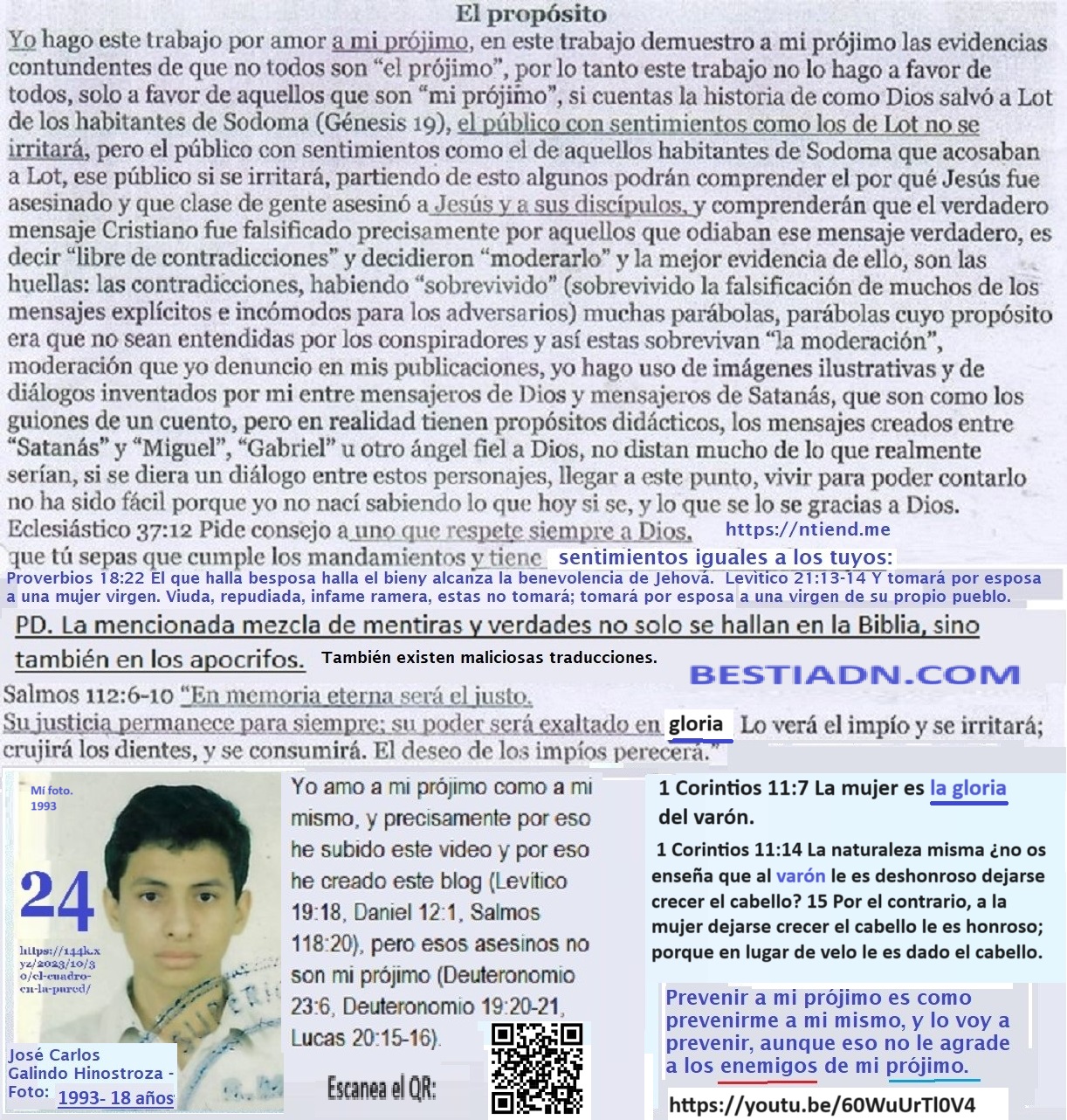 https://itwillbedotme.wordpress.com/wp-content/uploads/2025/03/idi01-ella-me-encontrara-la-mujer-virgen-me-creera-.docx Ella me encontrará, la mujer virgen me creerá. ( https://ellameencontrara.com – https://lavirgenmecreera.com – https://shewillfind.me ) Este es el trigo en la Biblia que destruye la cizaña romana en la Biblia: Apocalipsis 19:11 Entonces vi el cielo abierto, y había un caballo blanco; y el que lo montaba se llamaba Fiel y Verdadero, y con justicia juzga y hace la guerra. Apocalipsis 19:19 Y vi a la bestia, y a los reyes de la tierra, y a sus ejércitos reunidos para hacer guerra contra el que estaba sentado en el caballo y contra su ejército. Salmos 2:2-4 «»Los reyes de la tierra se levantan, y los gobernantes consultan unidos contra el Señor y contra su ungido, diciendo: ‘Rompamos sus ataduras y echemos de nosotros sus cuerdas.’ El que mora en los cielos se reirá; el Señor se burlará de ellos.»» Ahora, un poco de lógica básica: si el jinete lucha por la justicia, pero la bestia y los reyes de la tierra luchan contra este jinete, entonces la bestia y los reyes de la tierra están en contra de la justicia. Por lo tanto, representan el engaño de las falsas religiones que gobiernan con ellos. La gran ramera de Babilonia, que es la iglesia falsa creada por Roma, se ha considerado a sí misma «»la esposa del ungido del Señor»», pero los falsos profetas de esta organización que vende ídolos y palabras aduladoras no comparten los objetivos personales del ungido del Señor y de los verdaderos santos, porque los líderes impíos han elegido para sí mismos el camino de la idolatría, el celibato o la sacramentalización de matrimonios impíos a cambio de dinero. Sus sedes religiosas están llenas de ídolos, incluyendo falsos libros sagrados, ante los cuales se inclinan: Isaías 2:8-11 8 Su tierra está llena de ídolos; se postran ante la obra de sus manos, ante lo que hicieron sus dedos. 9 El hombre se ha inclinado, y el hombre se ha humillado; por tanto, no los perdones. 10 Métete en la peña, escóndete en el polvo, ante la temible presencia del SEÑOR y la gloria de su majestad. 11 La altivez de los ojos del hombre será abatida, y la soberbia de los hombres será humillada; solo el SEÑOR será exaltado en aquel día. Proverbios 19:14 Casa y riquezas son herencia de los padres, pero la mujer prudente es del SEÑOR. Levítico 21:14 El sacerdote del SEÑOR no tomará por esposa a una viuda, ni a una divorciada, ni a una mujer impura, ni a una ramera; tomará por esposa a una virgen de su propio pueblo. Apocalipsis 1:6 Y nos hizo reyes y sacerdotes para su Dios y Padre; a él sea la gloria y el dominio por los siglos de los siglos. 1 Corintios 11:7 La mujer es la gloria del hombre. ¿Qué significa en Apocalipsis que la bestia y los reyes de la tierra hacen la guerra al jinete del caballo blanco y su ejército? El significado es claro, los líderes mundiales están mano a mano con los falsos profetas que son diseminadores de las religiones falsas que dominan entre los reinos de la tierra, por razones obvias, eso incluye el cristianismo, el Islam, etc. Estos gobernantes están en contra de la justicia. y la verdad, cuáles son los valores que defiende el jinete del caballo blanco y su ejército leal a Dios. Como es evidente, el engaño es parte de los falsos libros sagrados que estos cómplices defienden con la etiqueta “Libros Autorizados de las Religiones Autorizadas”, pero la única religión que defiendo es la justicia, defiendo el derecho de los justos a no ser engañados con engaños religiosos. Apocalipsis 19:19 Entonces vi la bestia y los reyes de la tierra y sus ejércitos reunidos para hacer guerra contra el jinete del caballo y contra su ejército. Apocalipsis 19:11 Entonces vi el cielo abierto, y he aquí un caballo blanco. El que estaba sentado en él se llamaba Fiel y Verdadero, y con justicia juzga y hace la guerra. Ahora una lógica básica, si el jinete defiende la justicia, pero la bestia y los reyes de la tierra luchan contra este jinete, entonces la bestia y los reyes de la tierra están en contra de la justicia, por lo tanto defienden el engaño de las religiones falsas que gobiernan con ellos.Un duro golpe de realidad es a «Babilonia» la «resurrección» de los justos, que es a su vez la reencarnación de Israel en el tercer milenio: La verdad no destruye a todos, la verdad no duele a todos, la verdad no incomoda a todos: Israel, la verdad, nada más que la verdad, la verdad que duele, la verdad que incomoda, verdades que duelen, verdades que atormentan, verdades que destruyen.Esta es mi historia: José, un joven criado en enseñanzas católicas, vivió una serie de acontecimientos marcados por relaciones complejas y manipulaciones. A los 19 años inició una relación con Mónica, una mujer posesiva y celosa. Aunque José sentía que debía terminar la relación, su formación religiosa lo llevó a intentar cambiarla con amor. Sin embargo, los celos de Mónica se intensificaron, especialmente hacia Sandra, una compañera de clase que le hacía insinuaciones a José.