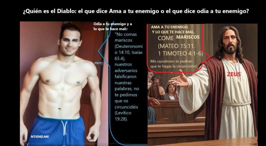 El amor a los enemigos es un engaño del enemigo de Dios, la negación de la ley que prohibe el consumo de alimentos como el cerdo y el murcielago también lo es; La Biblia tiene mentiras del imperio que jamás se convirtió a la fe que persiguió, el imperio romano persiguió esa fe para destruirla helenizandola. En la versión del evangelio falsificada por los romanos en Mateo 15:11 Jesús nos dice (Para negar la ley en Deuteronomio 14): «Coman de todo porque ya nada de lo que entra en la boca del hombre lo contamina», los romanos están así acusando a Jesús de algo que como fiel judío nunca dijo: Al igual que Antioco IV Epifanes, ellos tivieron en mente helenizar la verdadera religión. El evangelio fue helenizado por los romanos, como el rostro de Zeus, así nos dicen con las imágenes que era el rostro de Jesús; y la doctrina del griego Cleóbulo de Lindos es la que dice: «Ama a tu enemigo», pero nos dicen que Jesús la enseñó: Y eso es mentira. Antíoco IV Epífanes asesinó con torturas a ocho judíos, a siete hermanos y a su madre porque ellos se negaron a comer carne de cerdo porque Dios lo prohibe (Levítico 11, 2 Macabeos 7). La profecía en Isaías 65 confirma dos cosas: 1 # Dios ama a sus amigos y odia a sus enemigos. 2# El consumo de carne de cerdo se confirma prohibido. Antíoco, el rey griego: «¿Quieres comer carne de cerdo para que no te corten el cuerpo en pedazos? (2 Macabeos 7:7).» Zeús, el dios griego: «Nada de lo que yo Dios hice es malo si lo recibes rezándome, ¿se van a negar a comer carne de cerdo?, adorénme todos, los que no, vayán al fuego eterno (1 Timoteo 4:3, Hebreos 1:6, Lucas 11:28, Mateo 18:7).» La frase: «Haced el bien a vuestros amigos y enemigos, porque así conservareís los unos y os será posible atraer a los otros.» es de Cleóbulo de Lindos, «ama a tu enemigo es otra forma de decir lo mismo», pero aquello contradice la ley y los profetas, Jesús respetaba la palabra de Dios, pero los perseguidores romanos no.
