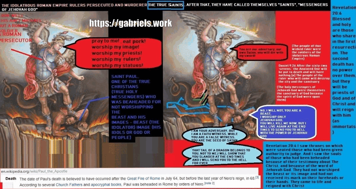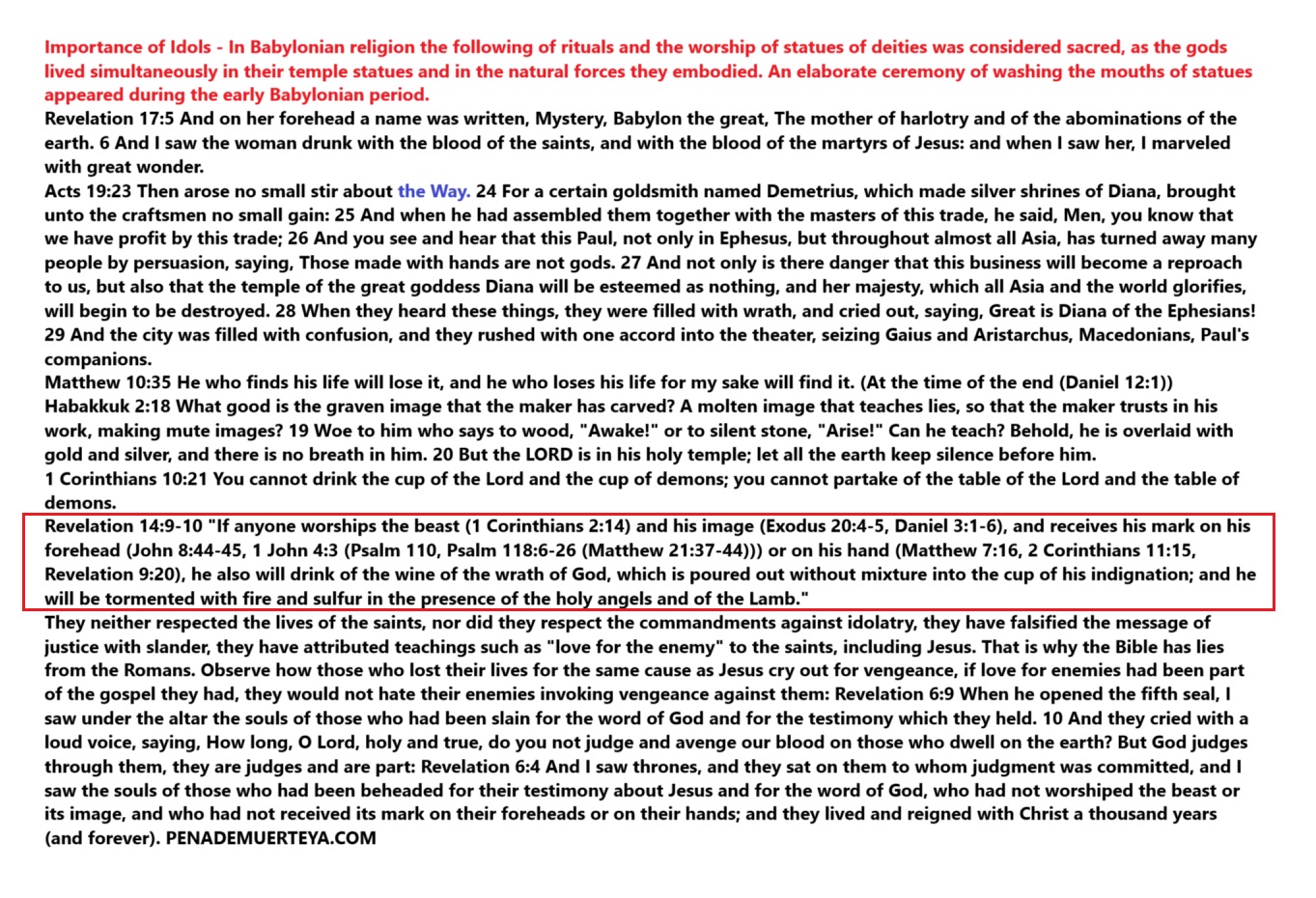 They neither respected the lives of the saints, nor did they respect the commandments against idolatry, they have falsified the message of justice with slander, they have attributed teachings such as «love for the enemy» to the saints, including Jesus. That is why the Bible has lies from the Romans. Observe how those who lost their lives for the same cause as Jesus cry out for vengeance, if love for enemies had been part of the gospel they had, they would not hate their enemies invoking vengeance against them: Revelation 6:9 When he opened the fifth seal, I saw under the altar the souls of those who had been slain for the word of God and for the testimony which they held. 10 And they cried with a loud voice, saying, How long, O Lord, holy and true, do you not judge and avenge our blood on those who dwell on the earth? But God judges through them, they are judges and are part: Revelation 6:4 And I saw thrones, and they sat on them to whom judgment was committed, and I saw the souls of those who had been beheaded for their testimony about Jesus and for the word of God, who had not worshiped the beast or its image, and who had not received its mark on their foreheads or on their hands; and they lived and reigned with Christ a thousand years (and forever). PENADEMUERTEYA.COM