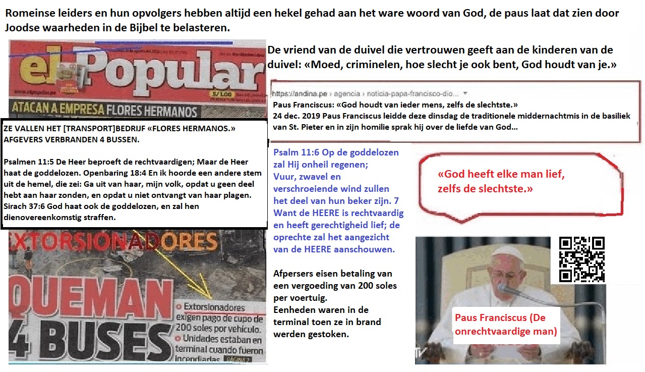 Hij zal zijn voeten wassen in het bloed van de goddelozen. 11 Dan zal de mens zeggen: Voorwaar, er is een beloning voor de rechtvaardigen; Er is zeker een God die op aarde oordeelt. Waar is de liefde voor vijanden in deze aanroeping tot God en in deze profetieën? Nergens. Jezus wist ook van tevoren dat de Romeinen zich nooit tot zijn religie zouden bekeren en dat ze zijn boodschappen en die van zijn getrouwe getuigen zouden vernietigen, daarom zei hij dit: Mattheüs 7:22 Velen zullen op die dag tegen mij zeggen: Heer, Heer, zullen wij niet in uw naam profeteren en in uw naam demonen uitdrijven? En vele wonderen doen in Uw Naam? 23 En dan zal ik hun zeggen: Ik heb u nooit gekend; Gaat weg van mij, gij werkers der ongerechtigheid. Net zoals de boodschap in Openbaring 6:9-10 een toespeling is op de profetie in Psalm 58:6-11, is deze boodschap in Mattheüs 7:22-23 een toespeling op deze profetie waar het duidelijk is dat hij van God houdt, maar zijn vijanden haat, als hij zijn vijanden haat en hij was geen huichelaar, dan zei hij nooit de boodschap in Mattheüs 5:38-48, het waren de religieuze hypocrieten “rooms-katholieken”, die met die boodschap in de Bijbel dat er staat “heb je vijanden lief”, ze hebben veel mensen afgeslacht in naam van hun religie in de onheilige inquisitie, die altijd in het voordeel was van afgoden en niet van gerechtigheid, omdat fraude en gerechtigheid onverenigbaar zijn: