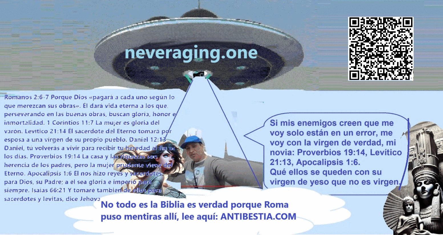 E dicono anche che la verità è il loro dio dai capelli lunghi, quel dio Giove, lo Zeus greco che proclamano con le loro immagini, lo hanno fatto attraverso un falso vangelo che dice di lui: «Io sono la verità, io sono la porta, adoratemi tutti voi dèi (Ebrei 1:6, Giovanni 14:16)». Era da supporre che quegli assassini odiassero la verità e per questo hanno ingannato e falsificato i veri messaggi, e hanno continuato a ingannare dicendo: «Non perseguitiamo più quella religione, ora la diffondiamo». Il mio «UFO» NTIEND.ME, emette luce. Quella luce distrugge le calunnie del drago o Satana, il cui nome significa «il calunniatore».