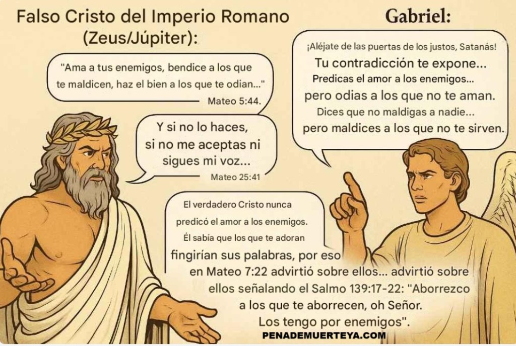 Apocalipsis 6:9 Cuando abrió el quinto sello, vi bajo el altar las almas de los que habían sido muertos por causa de la palabra de Dios y por el testimonio que tenían. 10 Y clamaban a gran voz, diciendo: ¿Hasta cuándo, Señor, santo y verdadero, no juzgas y vengas nuestra sangre en los que moran en la tierra? Los verdaderos mensajeros de Cristo y de su verdadero mensaje conocían las profecías y sabían que sus enemigos y perseguidores tenían en mente imponer el engaño mundial, pues conocían que la profecía en Daniel 8:25 debía tomar forma para que en el tiempo del fin, en el retorno de Cristo, el engaño sea destruido. En Apocalipsis 6:9-10, se está invocando entonces a que Dios cumpla sus promesas de justicia plasmadas en profecías como esta: Salmos 58:10 Se alegrará el justo cuando viere la venganza; Sus pies lavará en la sangre del impío. 11 Entonces dirá el hombre: Ciertamente hay galardón para el justo; Ciertamente hay Dios que juzga en la tierra. ¿Dónde está el amor a los enemigos en esta invocación a Dios y en estas profecías? En ningún lado. Jesús también sabía de antemano que los romanos nunca se iban a convertir a su religión y que destruirían sus mensajes y el de sus fieles testigos, por eso él dijo esto: Mateo 7:22 Muchos me dirán en aquel día: Señor, Señor, ¿no profetizamos en tu nombre, y en tu nombre echamos fuera demonios, y en tu nombre hicimos muchos milagros? 23 Y entonces les declararé: Nunca os conocí; apartaos de mí, hacedores de maldad. Así como el mensaje en Apocalipsis 6:9-10 es una alusión a la profecía en Salmos 58:6-11, este mensaje en Mateo 7:22-23 es una alusión a esta profecía donde es claro que él ama a Dios, pero odia a sus enemigos. Si él odia a sus enemigos y él no era hipócrita, entonces él nunca dijo el mensaje en Mateo 5:38-48. Fueron los hipócritas religiosos «católicos romanos», quienes con ese mensaje en la Biblia que dice «ama a tus enemigos», masacraron a mucha gente en nombre de su religión en la nada santa inquisición, que siempre estuvo a favor de los ídolos y no de la justicia, porque la estafa y la justicia son incompatibles: