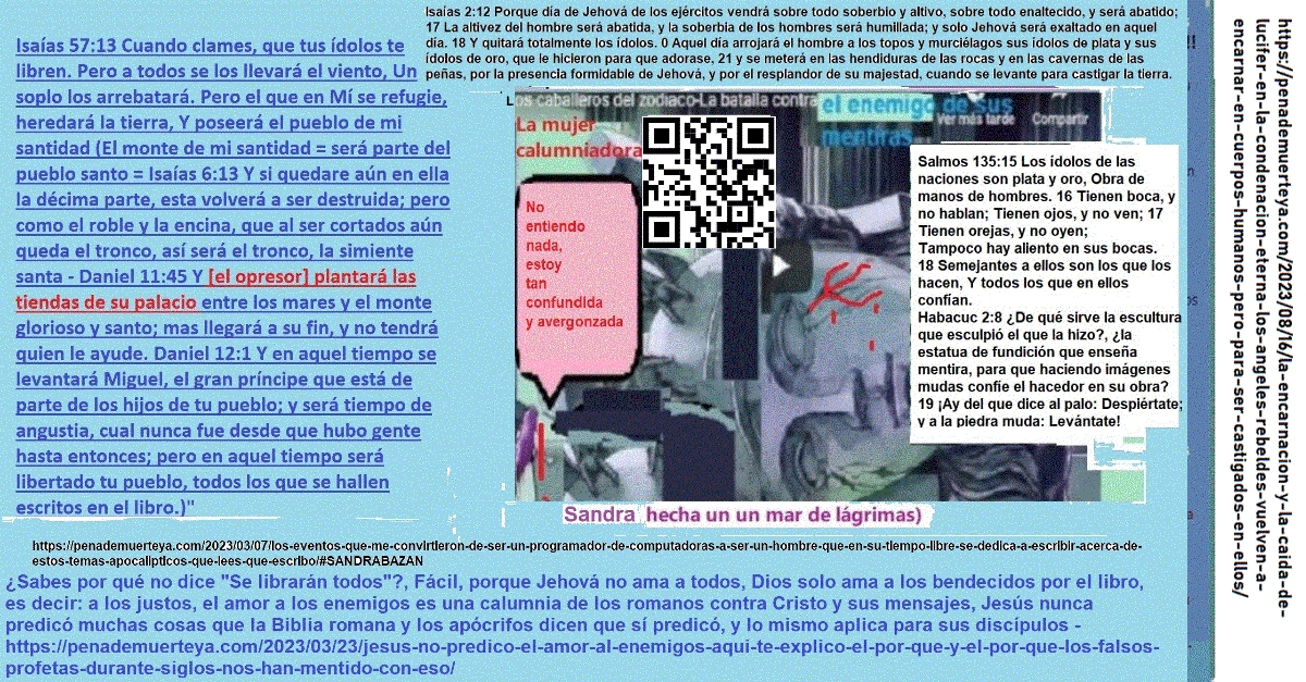 El juicio final en la profecía de Daniel que dice: Pero se sentará el Juez, y le quitarán su dominio para que sea destruido y arruinado, debe cumplirse… ¿Qué sentía Jesús por sus enemigos? ¿Qué sentían los santos por sus enemigos? ¿Amor u odio? Muchos se caerán de espaldas al notar como les han visto la cara y los han estafado; deberíamos reclamar indemnización al Vaticano y a sus cómplices por todo el tiempo que nos han hecho desperdiciar, y hablo en serio.