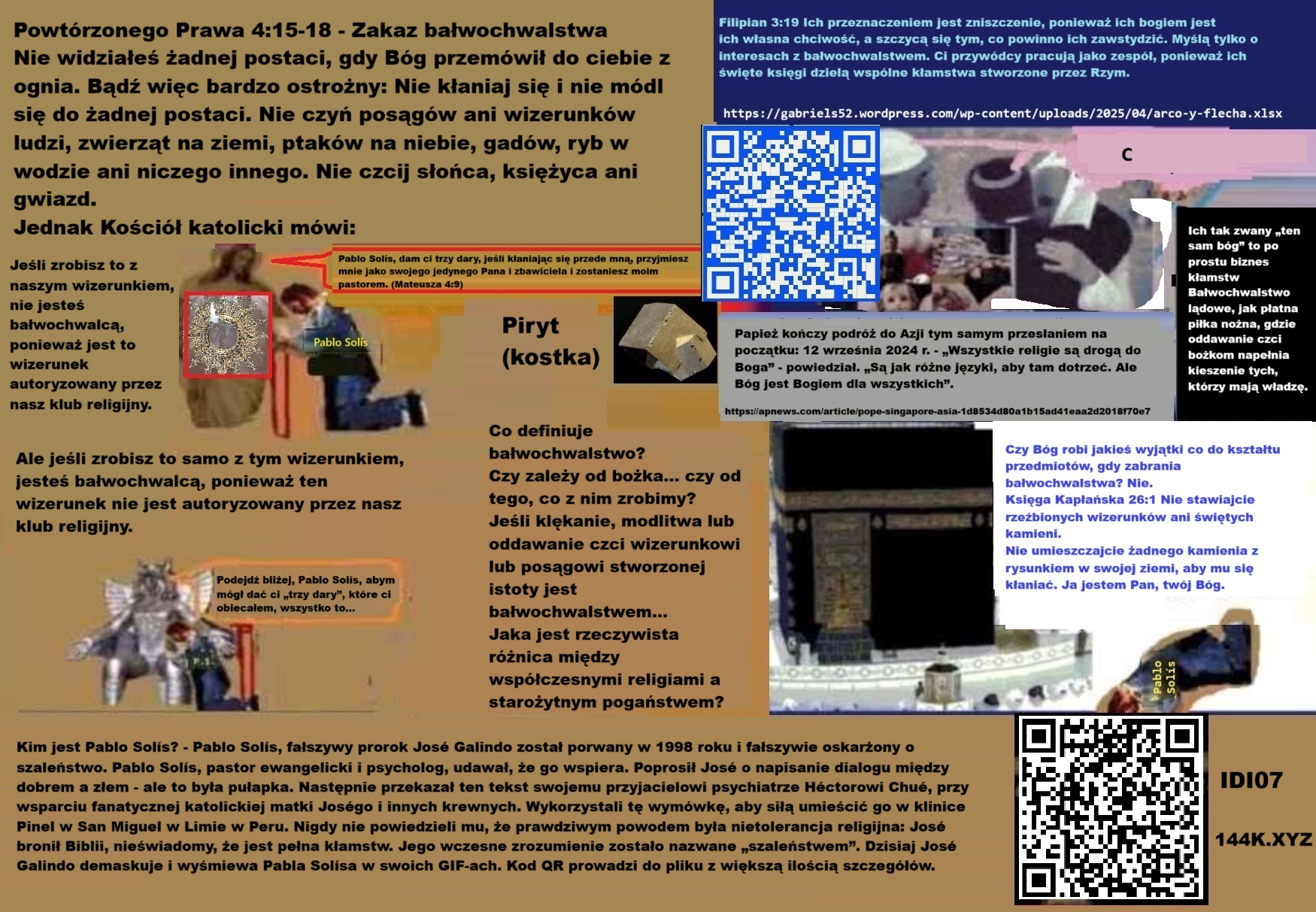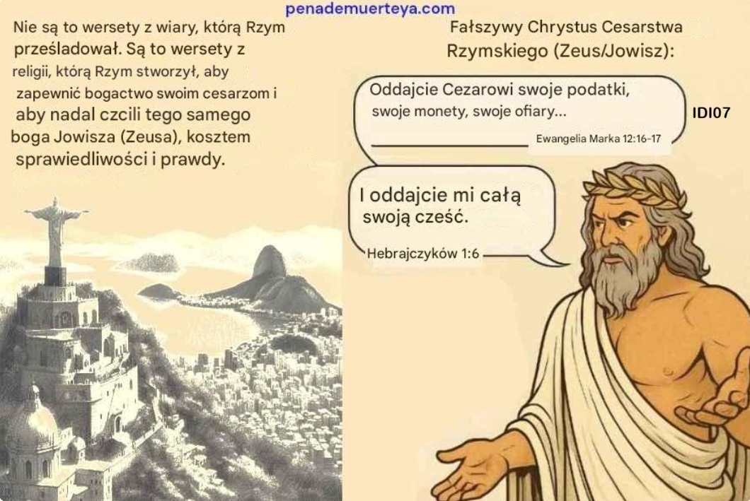 0 sekund temu Hipokryzja w najczystszej postaci: Robią to samo z innymi wizerunkami, ale twierdzą, że ich rzeczą nie jest bałwochwalstwo wobec wizerunków, ale „czczenie”. Mówią, że nie czczą wizerunku „Bestii” (rzymskiego prześladowcy), mówią, że nie modlą się do posągu uskrzydlonego rzymskiego żołnierza z mieczem i tarczą na cześć Cesarstwa Rzymskiego, które zabiło Jezusa, ale aby to ukryć, nazwali go „świętym Michałem”. Mimo to twierdzą, że czczą tylko Boga… Rzym nigdy nie nawrócił się na wiarę Jezusa: sfałszował ją. Rzym zawsze był niewierny Bogu, dlatego promował modlitwę do istot stworzonych, podając tysiące wymówek. Dlatego Biblia nosi ślady jej kłamstw: w niej Rzym prosił ludzi o uległość poprzez „nadstawianie drugiego policzka”, jednocześnie wymieniając bożki narodów nie na prawdę, ale na własne bożki: rzeźby Jowisza i Samaela, przebrane za wizerunki Jezusa i świętego Michała. Nawiasem mówiąc, prawdziwy Jezus i Święty Michał nigdy, pod żadnym pozorem, nie prosiliby nikogo, aby modlił się do nich lub ich wizerunków. Nie dajcie się zwieść: Hiszpania nie podbiła Ameryki; to przywódcy Kościoła rzymskokatolickiego wykorzystali do tego swój marionetkowy rząd, poszukując złota, srebra i nowych niewolników dla swoich bożków. Kraje te pozostają koloniami rzymskimi, dopóki flagi Watykanu powiewają na ich głównych placach. Kto potrafi zrozumieć, niech zrozumie.