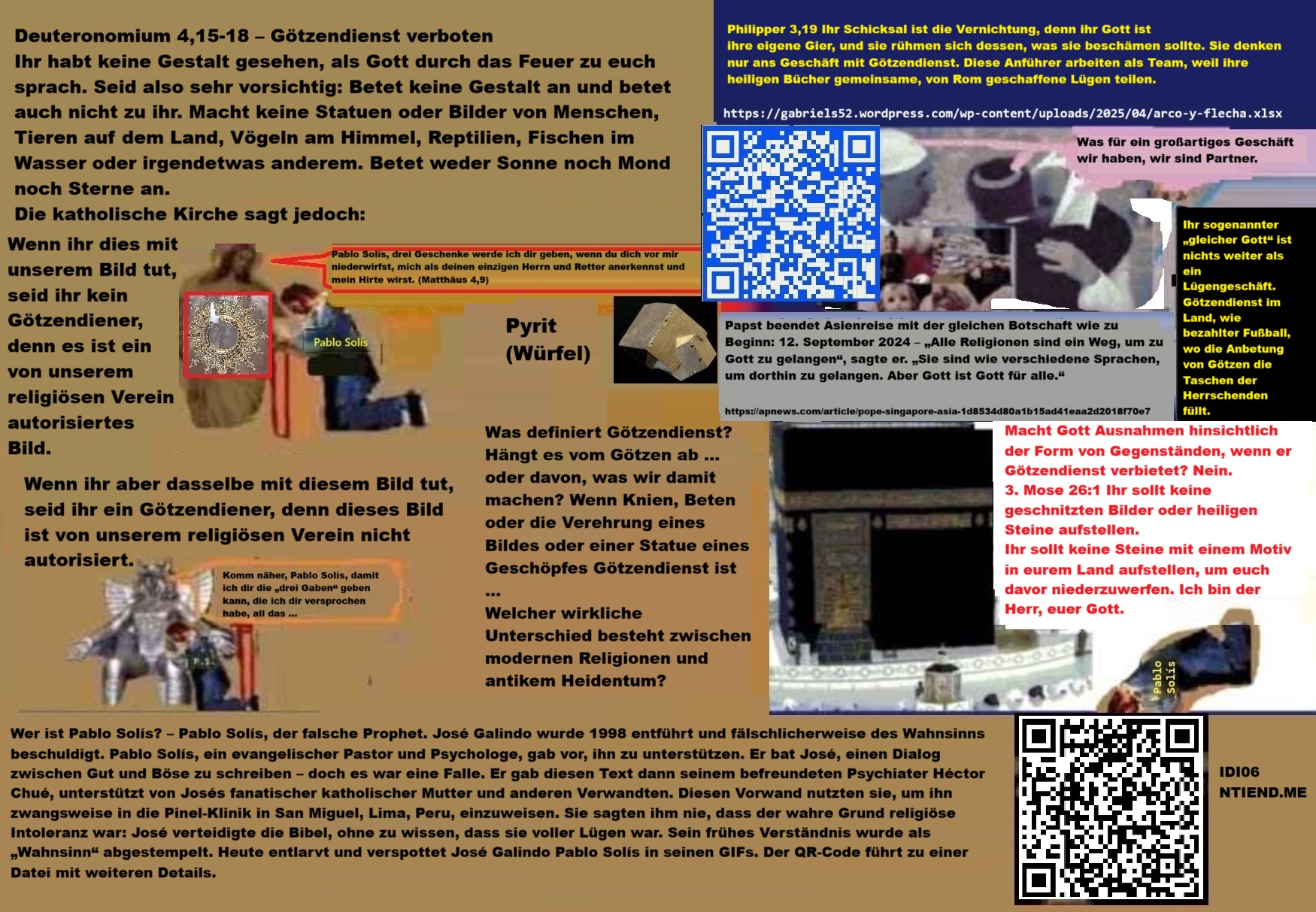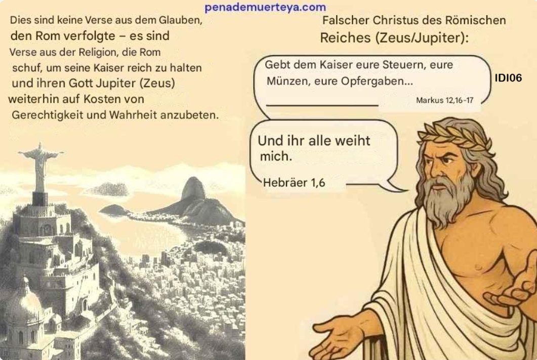 Vor 0 Sekunden Heuchelei in Reinkultur: Sie machen dasselbe mit anderen Bildern, aber sie sagen, ihr Ding sei nicht das Idolisieren von Bildern, sondern das „Verehren“. Sie sagen, sie beten das Bild des „Tieres“ (des römischen Verfolgers) nicht an, sie sagen, sie beten nicht zur Statue des geflügelten römischen Soldaten mit Schwert und Schild zu Ehren des Römischen Reiches, das Jesus tötete, sondern um es zu verschleiern, nannten sie ihn „Sankt Michael“. Trotzdem sagen sie, sie beten nur Gott an… Rom hat sich nie zum Glauben Jesu bekehrt, sondern ihn verfälscht. Rom war Gott immer untreu, weshalb es das Gebet zu Geschöpfen mit tausend Ausreden förderte. Deshalb trägt die Bibel Spuren ihrer Lügen: Mit ihr forderte Rom das Volk mit „Haltet die andere Wange hin“ zur Unterwerfung auf, während es die Götzen der Völker nicht gegen die Wahrheit, sondern gegen seine eigenen Götzen eintauschte: Skulpturen von Jupiter und Samael, getarnt als Bilder von Jesus und dem Heiligen Michael. Übrigens würden der wahre Jesus und der heilige Michael niemals, unter keinem Vorwand, jemanden bitten, zu ihnen oder ihren Bildern zu beten. Täuschen Sie sich nicht: Nicht Spanien hat Amerika erobert; es war die Führung der römisch-katholischen Kirche, die ihre Marionettenregierung dazu benutzte, um Gold, Silber und neue Sklaven für ihre Götzen zu erbeuten. Diese Länder bleiben römische Kolonien, solange die vatikanischen Flaggen auf ihren Hauptplätzen wehen. Wer es verstehen kann, der soll es verstehen.