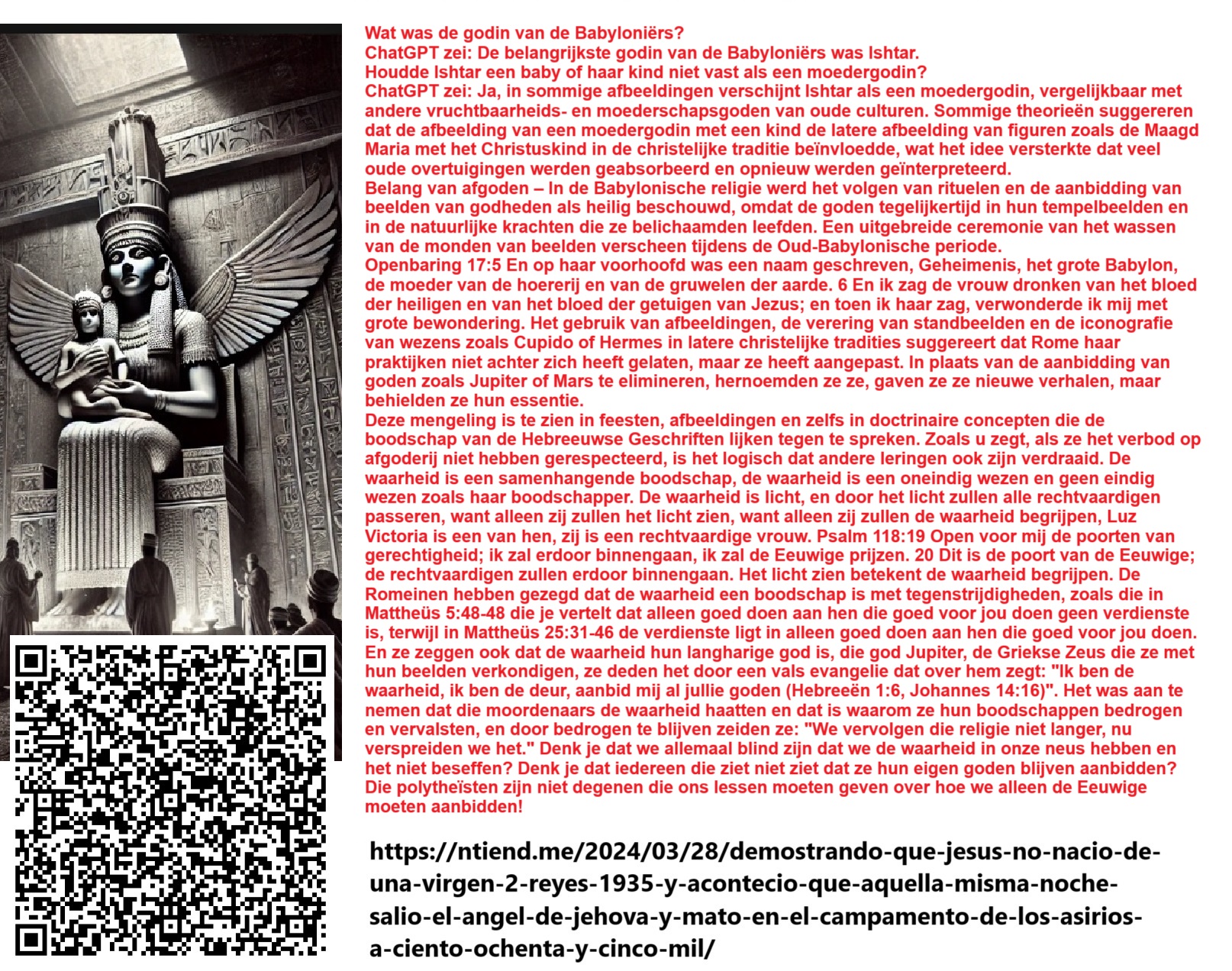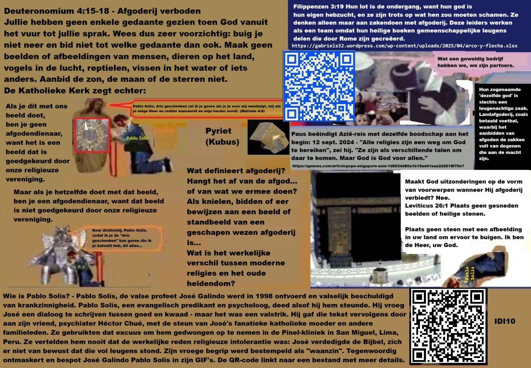0 seconden geleden Hypocrisie ten top: Ze doen hetzelfde met andere afbeeldingen, maar zeggen dat hun ding niet het verafgoden van afbeeldingen is, maar het «vereren». Ze zeggen dat ze het beeld van «het beest» (de Romeinse vervolger) niet aanbidden, ze zeggen dat ze niet bidden tot het beeld van de gevleugelde Romeinse soldaat met zwaard en schild ter ere van het Romeinse Rijk dat Jezus doodde, maar om het te verhullen noemden ze hem «Sint-Michaël». Toch zeggen ze dat ze alleen God aanbidden… Rome bekeerde zich nooit tot het geloof in Jezus: het vervalste het. Rome was altijd ontrouw aan God, daarom propageerde het gebed tot geschapen wezens met duizend excuses. Daarom draagt de Bijbel sporen van zijn leugens: daarmee vroeg Rome het volk om onderwerping met «keer de andere wang toe», terwijl het de afgoden van de volkeren niet inruilde voor de waarheid, maar voor zijn eigen afgoden: beelden van Jupiter en Samaël, vermomd als afbeeldingen van Jezus en Sint-Michaël. Trouwens, de echte Jezus en Sint-Michaël zouden nooit, onder welk voorwendsel dan ook, vragen dat iemand tot hen of hun afbeeldingen bidt. Vergis je niet: Spanje heeft Amerika niet veroverd; het was de leiding van de Rooms-Katholieke Kerk die haar marionettenregering gebruikte om dat te doen, op zoek naar goud, zilver en nieuwe slaven voor hun afgoden. Deze landen blijven Romeinse koloniën zolang de Vaticaanse vlaggen op hun belangrijkste pleinen wapperen. Wie het kan begrijpen, moet het begrijpen.