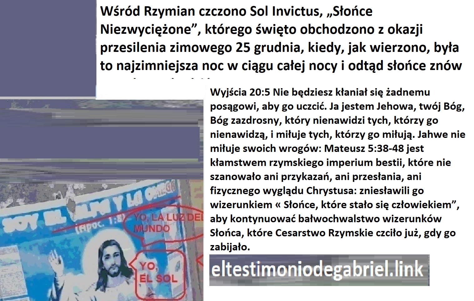 Riddle, o czym my mówimy?: Od chwili narodzin oskarżają Cię, mówiąc: «Urodził się z grzechem pierworodnym i potrzebuje chrztu». Kiedy twoi rodzice zabierają cię do swojego kościoła, uczą cię bić się w klatkę piersiową, mówiąc: «Wyznaję, że zgrzeszyłem i wyznaję też, że to moja wina, moja wielka wina». Jeśli masz wrogów, którzy cię atakują, mówią ci: «Jeśli chcesz otrzymać przebaczenie swoich grzechów, przebacz swoim wrogom, pamiętaj, że wszyscy jesteśmy grzesznikami.». Jeśli przekroczysz doktryny tego kościoła, nazywają cię grzesznikiem i mówią, że naruszasz Boże zasady. Rozumiem, że Bóg jest istotą niestworzoną i jest nadrzędny; Jeśli sprawiedliwość jest wartością wyższą, czy Bóg byłby za skazaniem niewinnych razem z winnymi?, Ten kościół jest pozostałością po imperium, które prześladowało grupę ludzi, którzy szanowali sprawiedliwość, imperium rzymskie było imperium, które zniszczyło pisma wiary, które prześladowało, jednak mówią wam, że to imperium nawróciło się na wiarę, którą prześladowało i że zaczął głosić orędzia, które prześladował, a także mówią wam, że w Biblii, którą przyjęli, znajdują się orędzia, które prześladowali, ale których później poświęcili się obronie, Pytam, czy im wierzysz?, Czy wydają ci się godni zaufania?, Jeśli jesteś sprawiedliwy, dlaczego miałbyś dołączyć do grupy ludzi, których sumienie zarzuca im nieprawość?, Jeśli jesteś sprawiedliwy, najlepszą rzeczą, jaką możesz zrobić, to nie nosić na swoich ramionach winy innych. Nie leży w twoim najlepszym interesie noszenie ciężaru niesprawiedliwych, którzy czynią niesprawiedliwość, ale którzy wierzą, że zostanie im przebaczone podążanie zasad przekazywanych przez innych niesprawiedliwych ludzi i za szerzenie ich kłamstw. Odpowiedź: Mówimy o religii Diabła, tego, którego czcili Rzymianie w przeszłości: Człowiek, Zeus, słońce (Triumwirat Rzymian). Wśród Rzymian czczono Sol Invictus, „Słońce Niezwyciężone”, którego święto obchodzono z okazji przesilenia zimowego 25 grudnia, kiedy, jak wierzono, była to najzimniejsza noc w ciągu całej nocy i odtąd słońce znów zaczęło wschodzić. Wyjścia 20:5 Nie będziesz kłaniał się żadnemu posągowi, aby go uczcić. Ja jestem Jehowa, twój Bóg, Bóg zazdrosny, który nienawidzi tych, którzy go nienawidzą, i miłuje tych, którzy go miłują. Jahwe nie miłuje swoich wrogów: Mateusz 5:38-48 jest kłamstwem rzymskiego imperium bestii, które nie szanowało ani przykazań, ani przesłania, ani fizycznego wyglądu Chrystusa: zniesławili go wizerunkiem « Słońce, które stało się człowiekiem”, aby kontynuować bałwochwalstwo wizerunków Słońca, które Cesarstwo Rzymskie czciło już, gdy go zabijało.