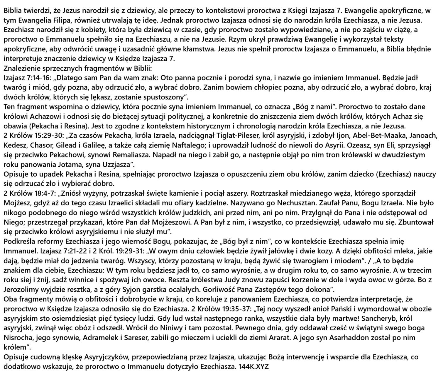Biblia stwierdza, że Jezus narodził się z dziewicy, ale jest to sprzeczne z kontekstem proroctwa z rozdziału Izajasza 7. Apokryficzne Ewangelie, w tym Ewangelia Filipa, również utrzymują tę ideę. Jednak proroctwo Izajasza odnosi się do narodzin króla Ezechiasza, a nie Jezusa. Ezechiasz urodził się od kobiety, która była dziewicą w czasie, gdy prorokowano, a nie po zapłodnieniu, i proroctwo o Emmanuelu zostało spełnione przez Ezechiasza, a nie przez Jezusa. Rzym ukrył prawdziwe Ewangelie i używał tekstów apokryficznych, aby odwrócić uwagę i legitymizować główne kłamstwa. Jezus nie wypełnił proroctw Izajasza o Emmanuelu, a Biblia błędnie interpretuje znaczenie dziewicy w Izajasza 7.