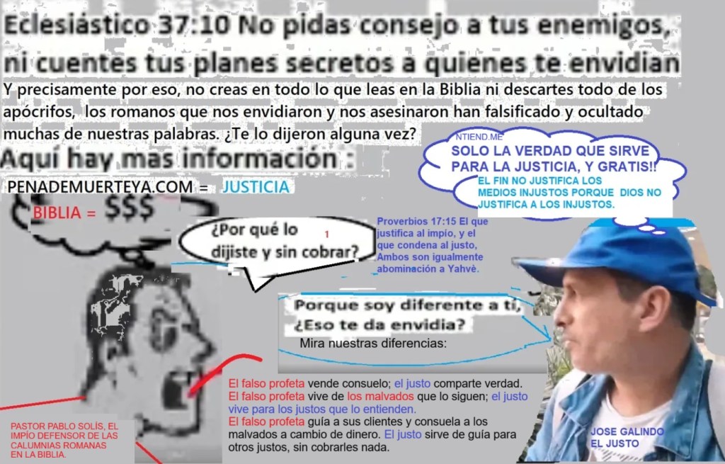 No soy un defensor de la Biblia, sino un analista de ella, debido a sus graves contradicciones. Cuando los falsos testigos relatan sus actos, una de las señales más claras de su mentira es la incongruencia de sus propias palabras. Tienen miedo a los debates argumentados; por eso huyen de ellos. Exigen sumisión en la creencia ciega, porque la razón jamás los defenderá. Demonizan a sus críticos, atacan al que habla con coherencia, pero nunca refutan sus argumentos, porque saben que son irrefutables. Pensar si realmente se puede caminar sobre el mar te hace dudar, y dudar —según ellos— te aparta de Dios. Así te enseñan a no pensar, a creer sin razón. Porque una mente que no pregunta obedece… y una que obedece sin pensar es la más fácil de engañar. «Según podemos inferir después de leer Isaías 63: 3-5, Isaías 11: 1-5 y Apocalipsis 19: 11-19, ¿no defiende el jinete del caballo blanco el “ojo por ojo”? Si reconoces que es así, entonces, ¿Quién es ese hombre de cabello largo que extrañamente se asemeja al dios griego Zeus y trae una doctrina de amor a los enemigos que, curiosamente, es la frase de un griego llamado Cléobulo de Lindos? ¿No crees que él caerá en el mar de fantasías que inventó en boca de quienes hicieron pasar sus palabras como las de Dios? El amigo fiel merece el amor de los fieles, ¿pero el enemigo también? ¿Crees que eso lo dijo realmente el amigo fiel, o el infiel Imperio Romano que lo persiguió? ¿Acaso puede el injusto volverse amigo del justo? Si fuese así, ¿por qué Daniel 12: 10 dice lo que dice, y por qué el jinete del caballo blanco no hace la paz con ellos, en vez de hacer la guerra contra ellos? Si te hice pensar… eso no le gustó a los falsos testigos que te mencioné al inicio. Leer y entender https://lavirgenmecreera.com/el-mensaje-principal-the-main-message/ Decir que siquiera uno de los santos se decidió por el celibato y lo llamó “don” es una vil calumnia de la serpiente encarnada en los falsos santos que Roma introdujo secretamente para destruir la verdadera religión. No consentiré malos pensamientos, como aquellos que me hagan creer que es imposible desmentir con éxito aquella calumnia del Imperio Romano y sus falsos santos, quienes nos dicen que la gloria de la recompensa en el reino de los cielos consistirá en hombres justos solos, en lugar de estar unidos en matrimonio con mujeres, según la acusación en Mateo 22:30. Tampoco aceptaré aquella mentira que dice que los santos renunciarían a la gloria del matrimonio con mujeres para abrazar el celibato (1 Corintios 7:1 y 1 Corintios 7:9-10). Ni aceptaré la calumnia que nos dice que ellos concibieron pensamientos impuros, como aquellos en Mateo 5:11 y 1 Timoteo 4:1-6, donde se los acusa de promover el consumo de alimentos que Dios llamó impuros y prohibió para siempre, como la carne de cerdo, de mariscos o de murciélago. Ni consentiré que se crean mentiras como aquellas en Lucas 23:34 y Efesios 3:7, que nos dicen que los justos amaron a sus enemigos y murieron predicando el amor inmerecido. En este sentido, si eso fuese verdad, ¿por qué en Apocalipsis 6 ellos piden venganza contra quienes los mataron? Hay una directa contradicción entre Hechos 7:57-60 y Apocalipsis 6:9-10, porque una de las partes es la mentira del enemigo de ellos. Si Dios dictó el ojo por ojo contra los enemigos de los justos en Deuteronomio 19:20-21, es porque eso es justicia, ya que la justicia consiste en dar a cada cual su merecido; y el Imperio Romano fue todo, menos un imperio justo. Este blog tiene dos dominios que evocan estos mensajes: “ella me encontrará” y “la virgen me creerá”, porque quiero reflejar mis deseos y, de paso, defender los deseos de los hombres justos, expresados con claridad aquí: 1 Corintios 11:7 – La mujer es la gloria del hombre. Levítico 21:13-15 – Tomará por esposa a una mujer virgen. No tomará viuda, ni repudiada, ni infame, ni ramera, sino tomará de su pueblo una virgen por mujer, para que no profane su descendencia en sus pueblos; porque yo Jehová soy el que los santifico. A diferencia de los impostores, quienes adoran a los mismos antiguos dioses romanos —Marte, el Sol, Artemisa, Júpiter— pero por medio de estatuas casi idénticas y de otros nombres, los verdaderos santos consideraban conseguir una buena esposa una bendición: Proverbios 18:22 – El que halla esposa halla el bien, y alcanza la benevolencia de Jehová. La Biblia contradice la Biblia porque Roma contradijo la religión que persiguió y cambió muchas cosas para llamar a mucho de lo bueno “Antiguo Testamento” y a su helenismo “Nuevo Testamento”. El “ojo por ojo” justificado, ellos lo cambiaron por “ofrece el otro ojo a tu enemigo”, pues el enemigo nunca cambió; solo se disfrazó de santo por medio de nombres que no le pertenecen. Esto no es Antiguo Testamento versus Nuevo Testamento, pues Roma infiltró sus mentiras en todos los textos que después llamó “La Biblia”. Salmos 118:18 Jehová me castigó gravemente, Mas no me entregó a la muerte. 19 Abridme las puertas de la justicia; Entraré por ellas, alabaré a Jehová. 20 Esta es puerta de Jehová; Por ella entrarán los justos.